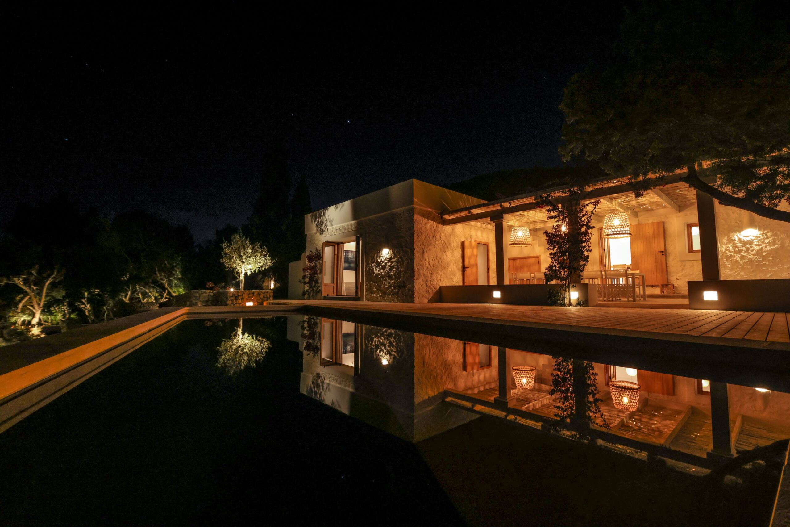 All 5 double bedrooms have en-suite bathrooms – totalling 6 bathrooms, 1 toilet and an outside bathroom with shower. The villa occupancy is 10+2. The layout of the house allows for maximum privacy, with three bedrooms having their own outside porch. The beds are twin sized with the option to make them king sized beds.