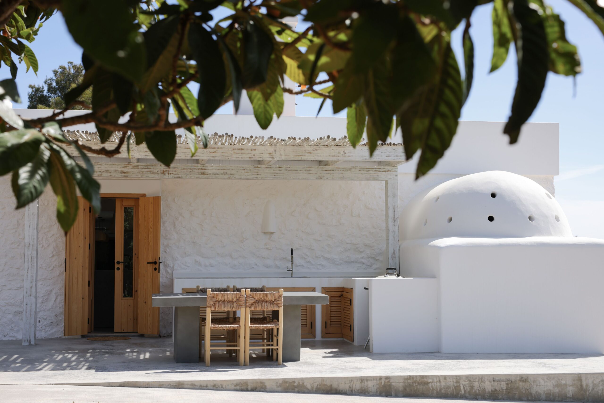 It enjoys an open plan living room area with a fireplace and an opening onto the main terrace. The modern kitchen is fully equipped with 2 refrigerators and a large outdoor freezer. It counts with several dining areas: one indoor and one outdoor dining area which holds 12 people as well as 2 outdoor tables near the barbecue area.