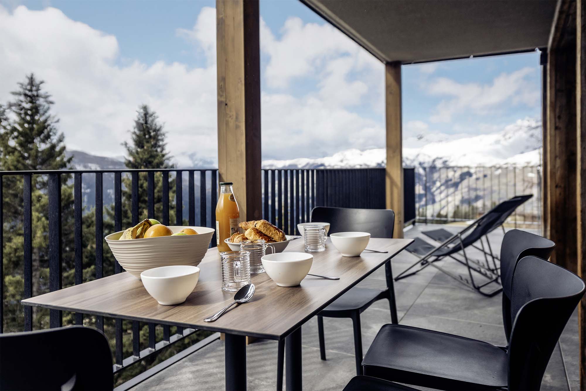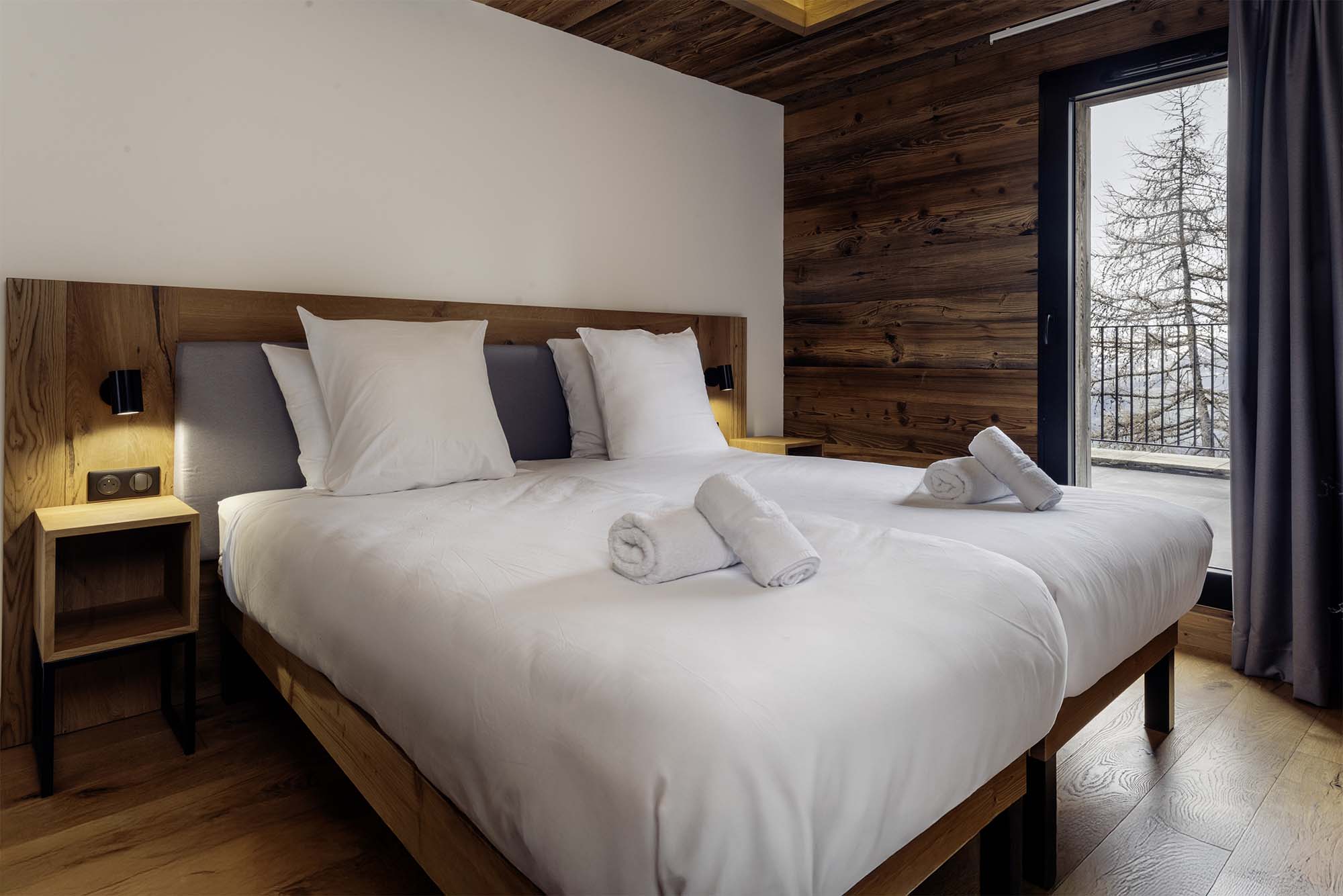 Chalet No. 4 has been tastefully decorated in a contemporary style, with a strong emphasis on wood and high-quality furnishings throughout. Situated on the second floor and accessible by lift, this spacious 150 m² chalet apartment comfortably hosts up to 14 guests. The generous living area is bright and airy, with large windows on two sides that open onto a wide terrace. Here, you’ll find an outdoor jacuzzi—perfect for unwinding in bubbling water while admiring the mountain views. The 40 m² terrace is also accessible from the bedrooms, enhancing the sense of space and connection to the outdoors. This chalet apartment includes a fully equipped kitchen, a welcoming dining area, and practical amenities such as ski lockers with boot dryers. The sleeping arrangements include four twin bedrooms—two with en-suite shower rooms and one with an en-suite bathroom. There is also a family suite comprising a bedroom with two twin beds (which can be joined to form a double) and an en-suite bathroom with WC, plus an alcove with a bunk bed and its own en-suite shower room. Additional facilities include two separate WCs and an extra shower room with a walk-in shower.
