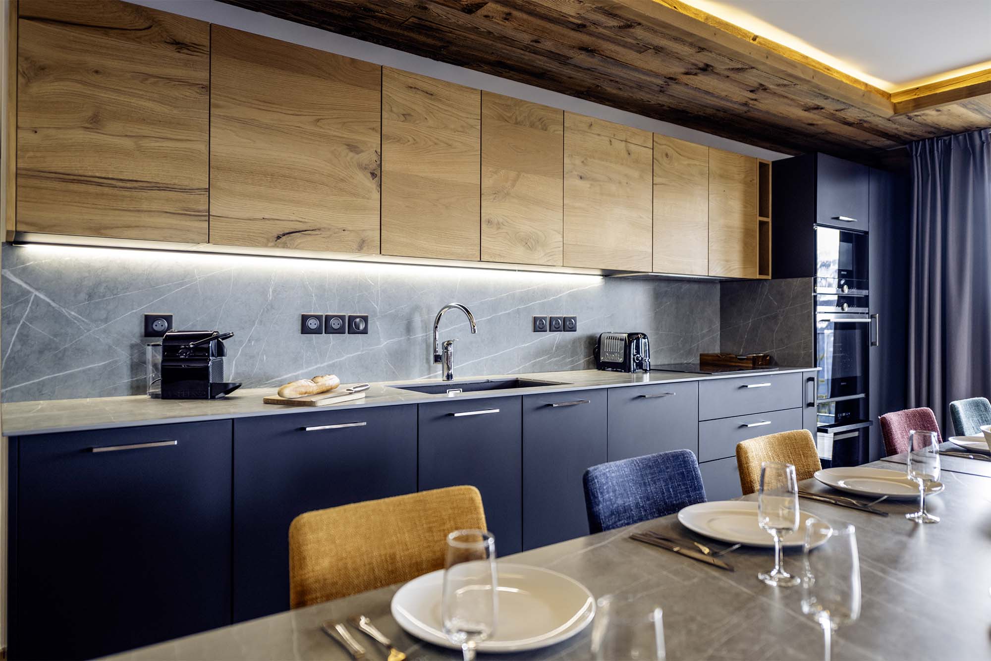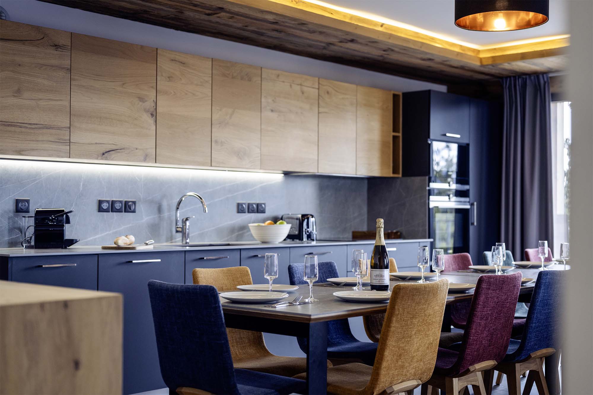 A fully equipped kitchen with Nespresso coffee machine, filter coffee machine, wine cellar, hob, oven, fridge, dishwasher, microwave, kettle