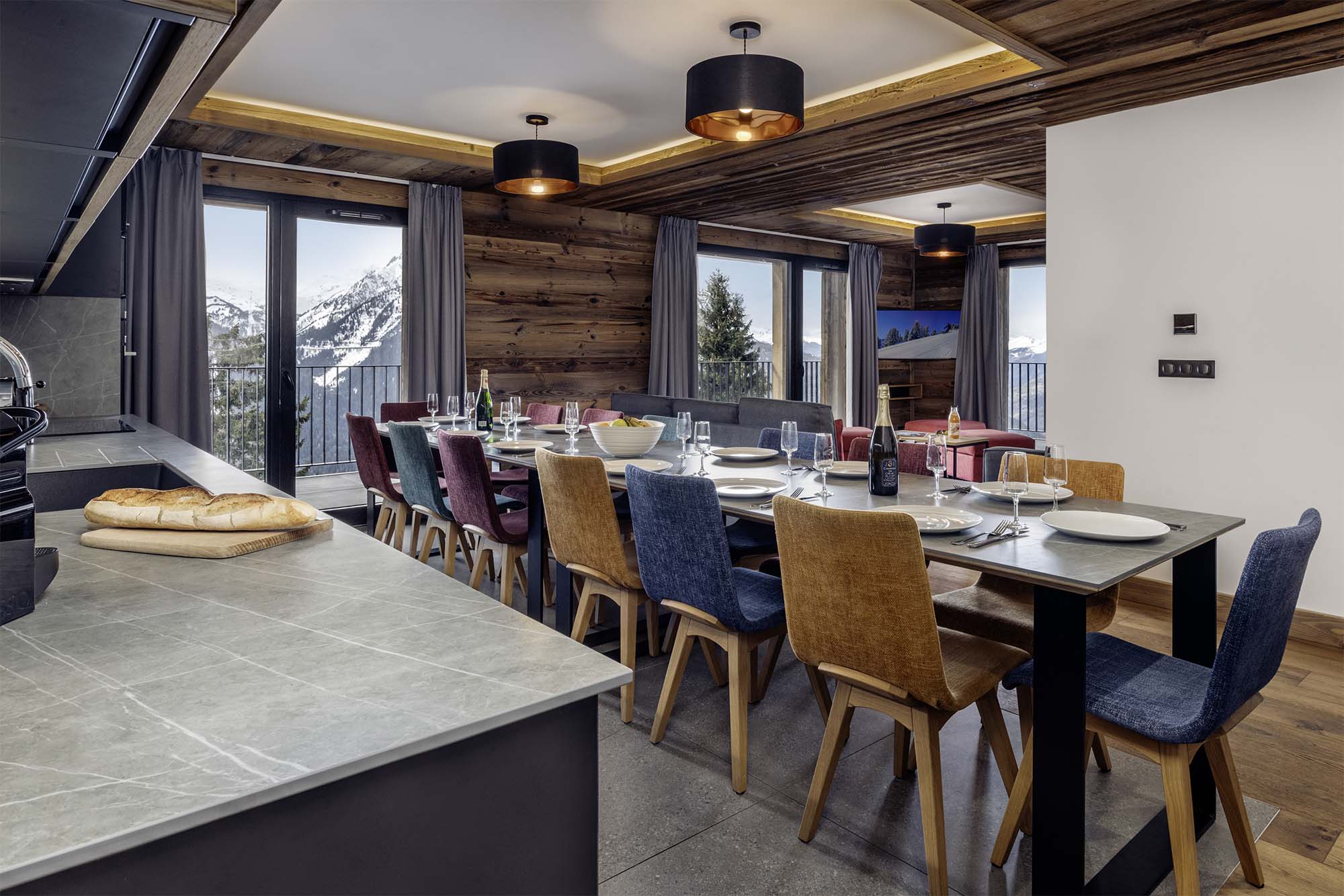 The recently-built Résidence L’Orée du Bois enjoys a prime location that combines peaceful surroundings with convenient access to local amenities. Located on the second floor, this 150 m² chalet apartment seamlessly blends modern design with traditional charm, featuring interiors crafted by local artisans. Ideal for large groups of friends or family, it comfortably accommodates up to 14 guests. The spacious terrace, accessible from all bedrooms and the living area, includes an outdoor hot tub, perfect for relaxing while taking in panoramic views of the valley, cocktail in hand.