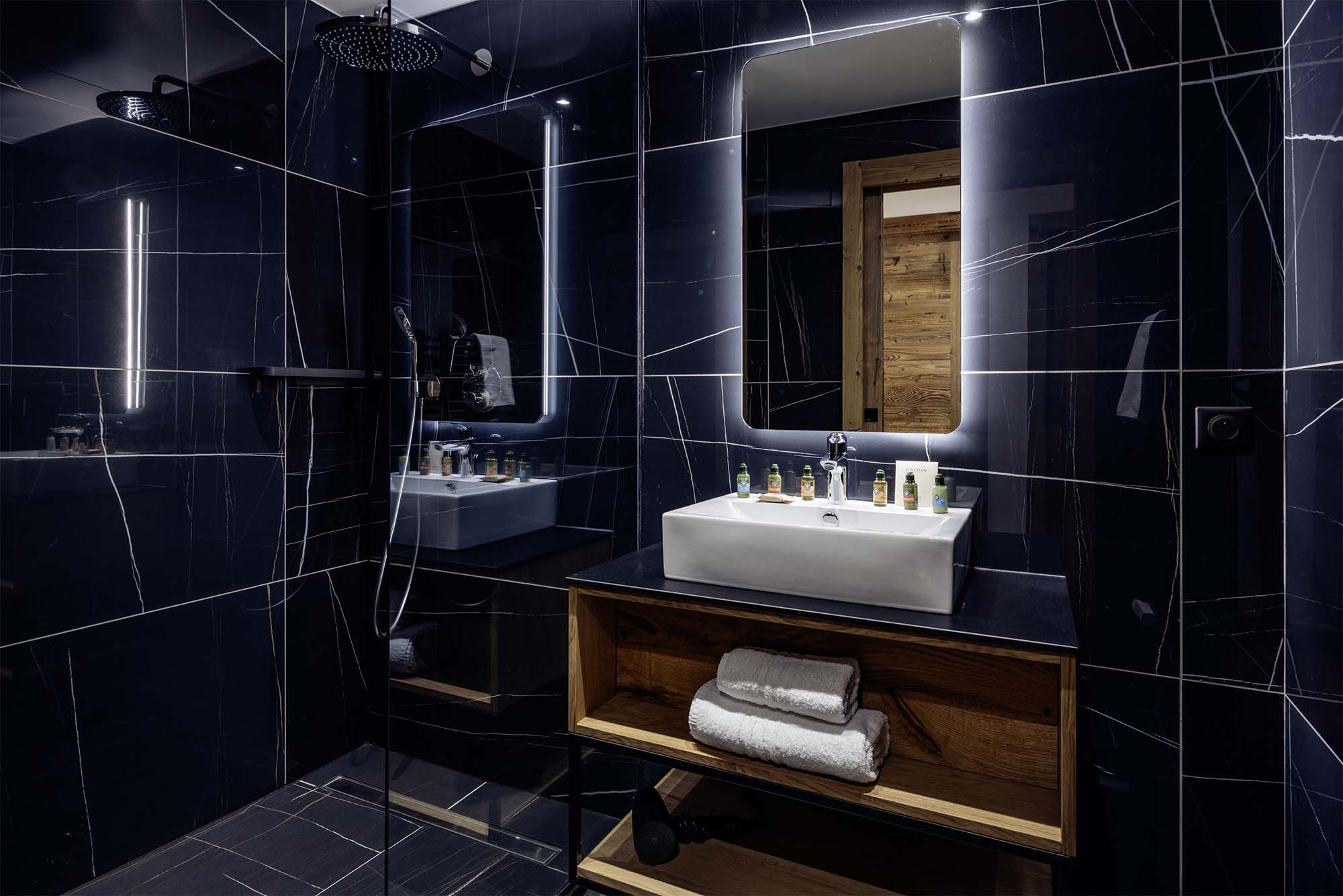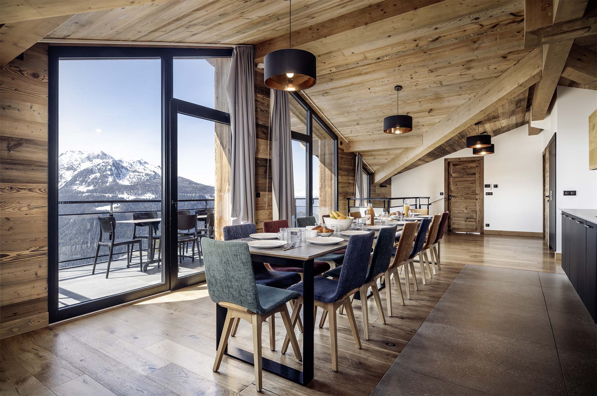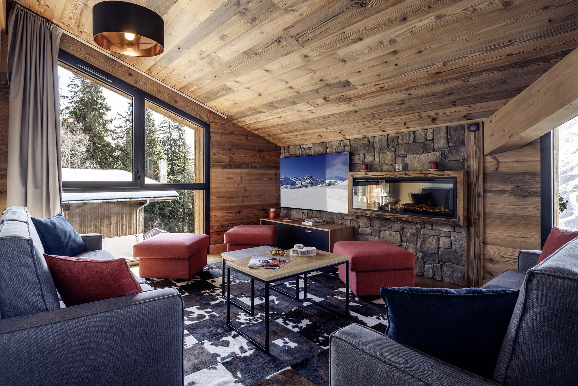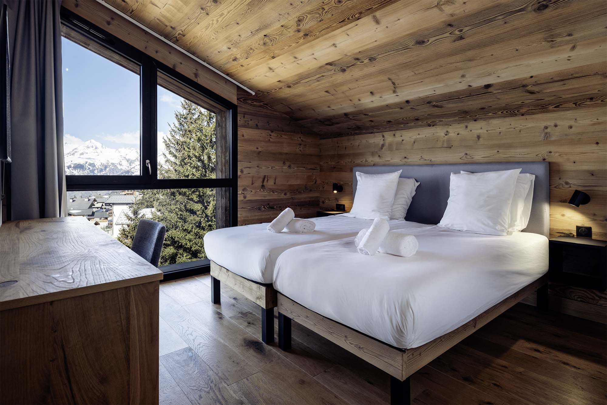 Chalet No. 6 is a generously sized, two-floor 150 m² accommodation located on the top floor of the residence and accessible by lift. On the ground floor, you’ll find two bedrooms with twin beds, a wellness area with an indoor jacuzzi, two shower rooms, and a separate WC. The first floor features a bright and spacious living room with a full-height window that spans the entire wall, opening onto a 20 m² south-facing terrace, as well as a fully equipped kitchen and a cosy lounge area with a flat-screen TV and electric fireplace, ideal for relaxing after a day on the slopes. This floor also includes a family suite with a bedroom with twin beds, a private bathroom with WC, and an enclosed mezzanine with two single beds. Additionally, there is a double bedroom with its own shower room and WC, and two twin bedrooms, each with an en-suite shower room and WC.