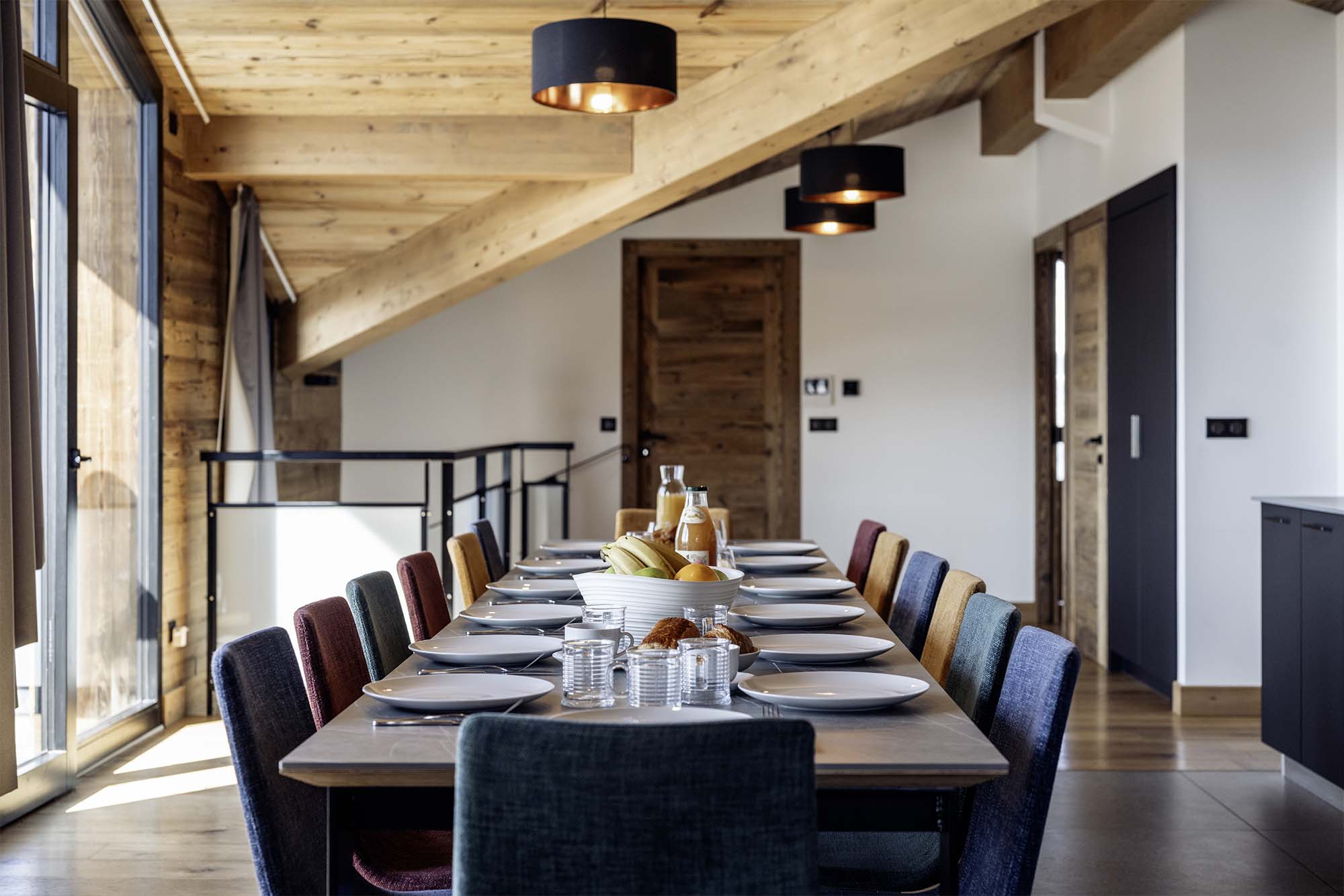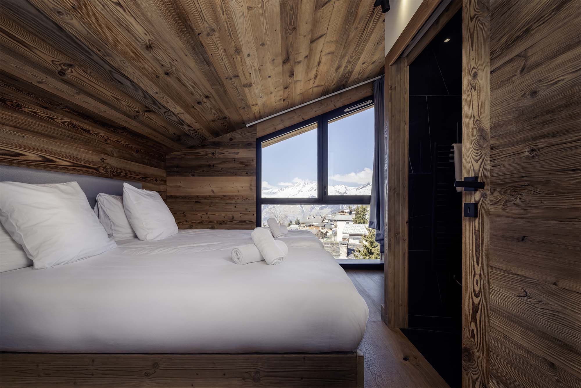 Tucked away in a quiet corner of La Rosière and just a few minutes from the centre, Résidence L’Orée offers the ideal retreat for large groups of friends or families. This 150 m² chalet apartment spread on two floors comfortably accommodates up to 14 guests and is designed for relaxation and comfort. A striking south-facing window spans the entire wall of the living room, flooding the space with natural light and offering stunning views. It also includes a wellness area with a jacuzzi and an electric fireplace, creating the perfect setting to unwind after a day in the mountains.