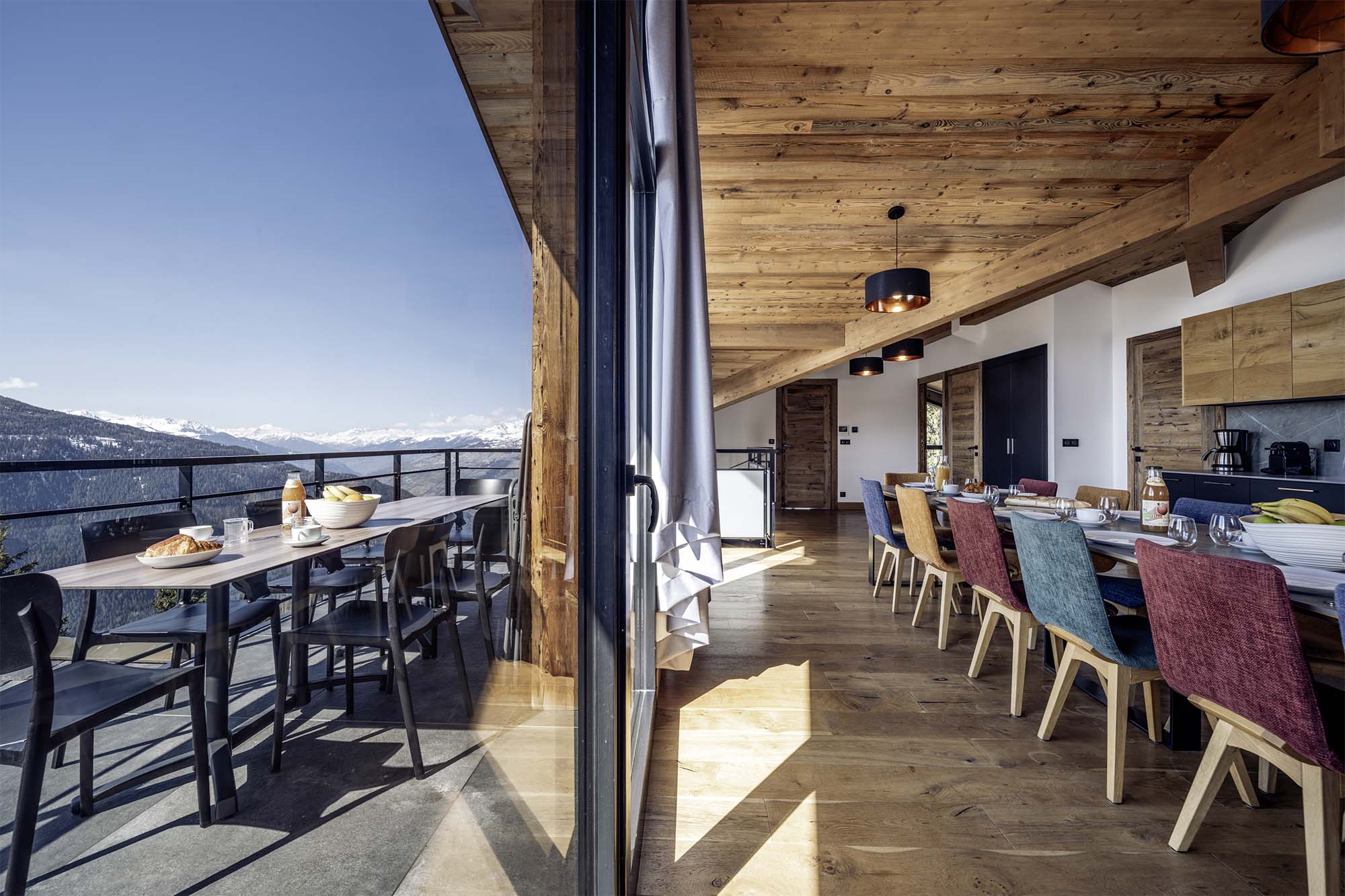A south-facing 20 m² terrace with panoramic views of the Tarentaise valley